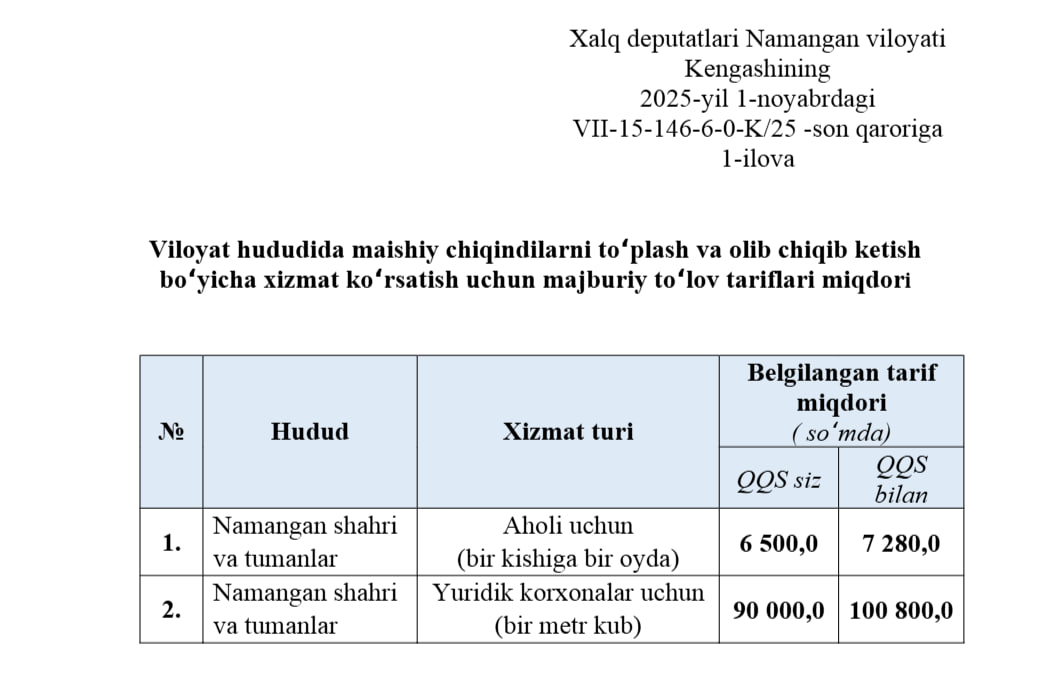Халқ депутатлари Наманган вилояти кенгаши 1 ноябр куни маиший чиқиндиларни тўплаш ва олиб кетиш тарифларини ошириш ҳақида қарор қабул қилган.