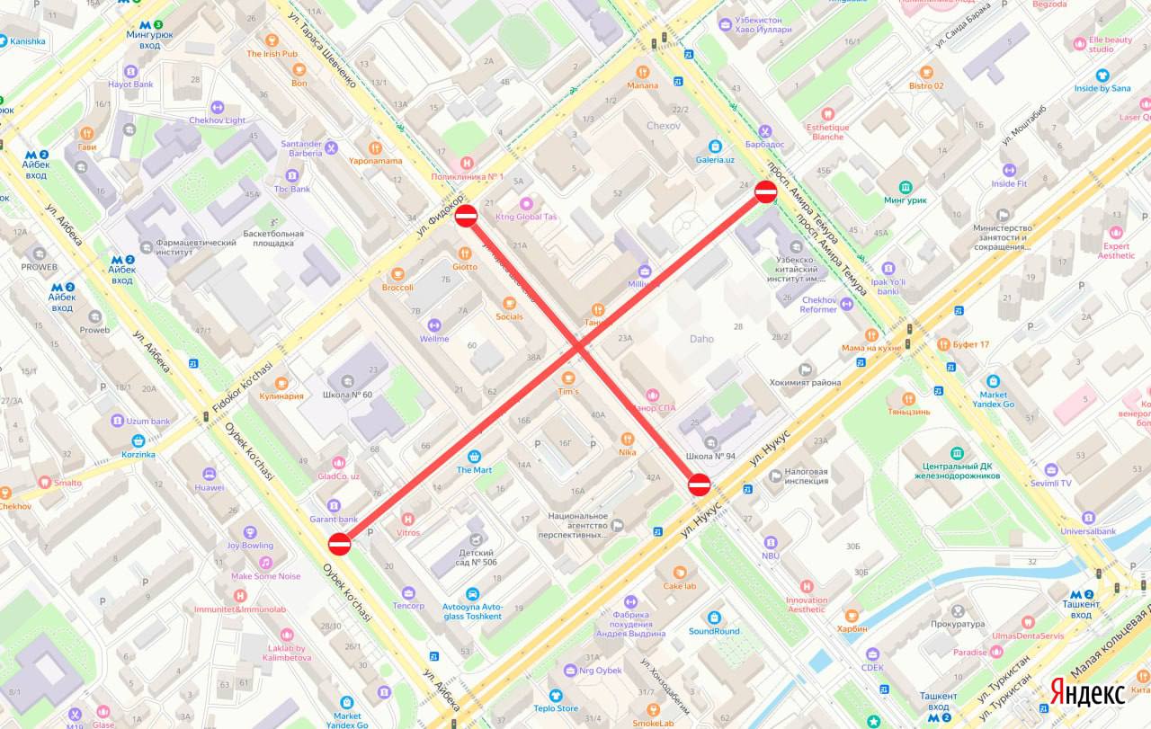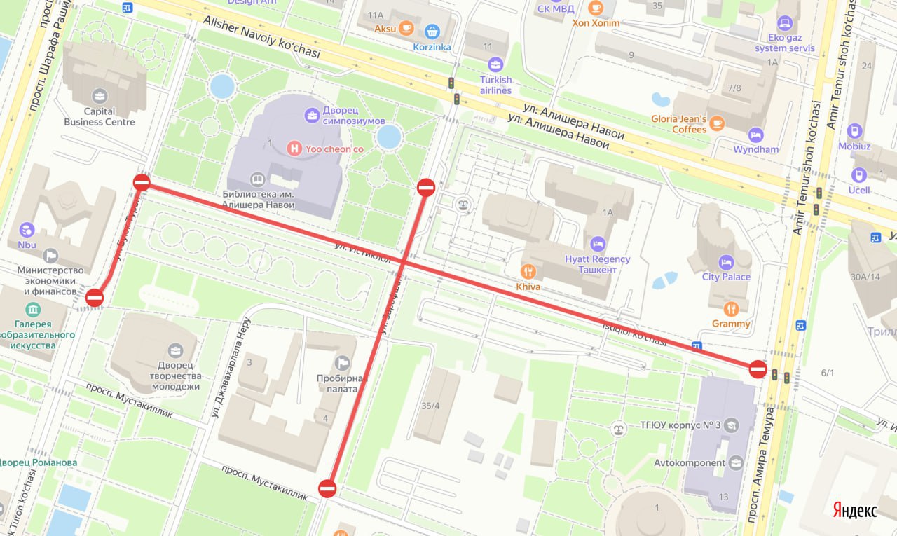 Янги йил байрами тадбирларига тайёргарлик кўриш ва уни юқори савияда ўтказиш, шунингдек, байрам тадбирлари вақтида аҳоли хавфсизлигини таъминлаш ҳамда жамоат тартибини сақлаш мақсадида пойтахтнинг қуйидаги ҳудудларида транспорт воситалари учун ҳаракат чекловлари ўрнатилади: