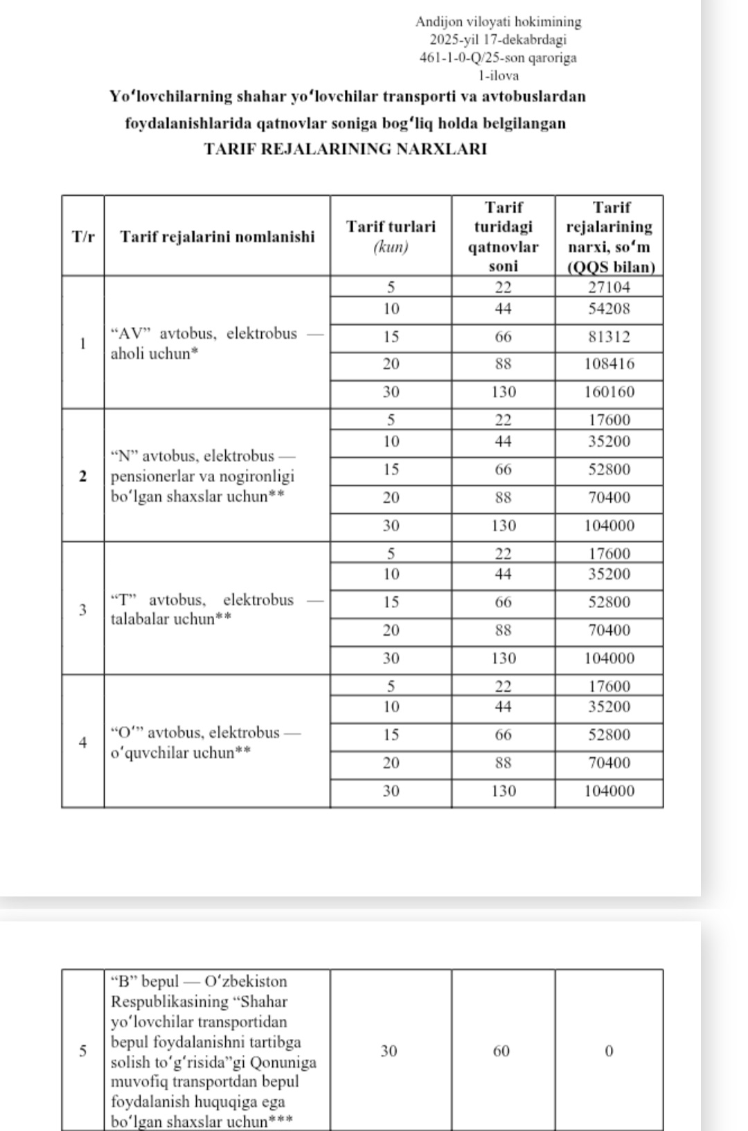 Андижонда жамоат транспорти нархлари ошади. Бу ҳақда 2025 йил 17 декабрда вилоят ҳокимининг қарори эълон қилинди.