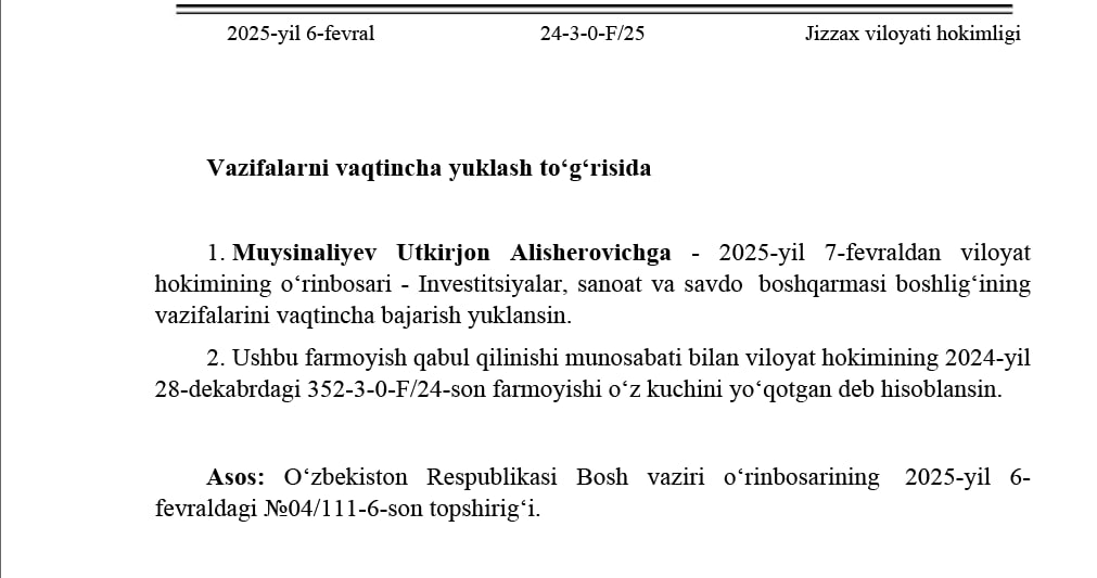 2025 йил феврал ойида Жиззах вилояти ҳокимининг фармойиши билан Муйсиналиев Ўткиржон Алишеровичга вилоят ҳокими ўринбосари – инвестициялар, саноат ва савдо бошқармаси бошлиғи вазифасини вақтинча бажариш юклатилган. Ҳужжатда сабаби келтирилмаган.