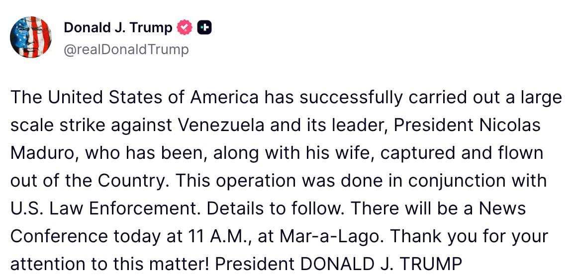 “Америка Қўшма Штатлари Венесуэла ва унинг етакчиси, президент Николас Мадурога қарши кенг кўламли зарбани муваффақиятли амалга оширди, у рафиқаси билан бирга қўлга олиниб, мамлакатдан олиб кетилди.