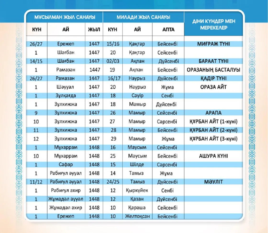 2026 йилда Қозоғистонда Рамазон ойи қачон бошланиши айтилди. Қозоғистон мусулмонлари диний бошқармасининг расмий тақвими эълон қилинди.