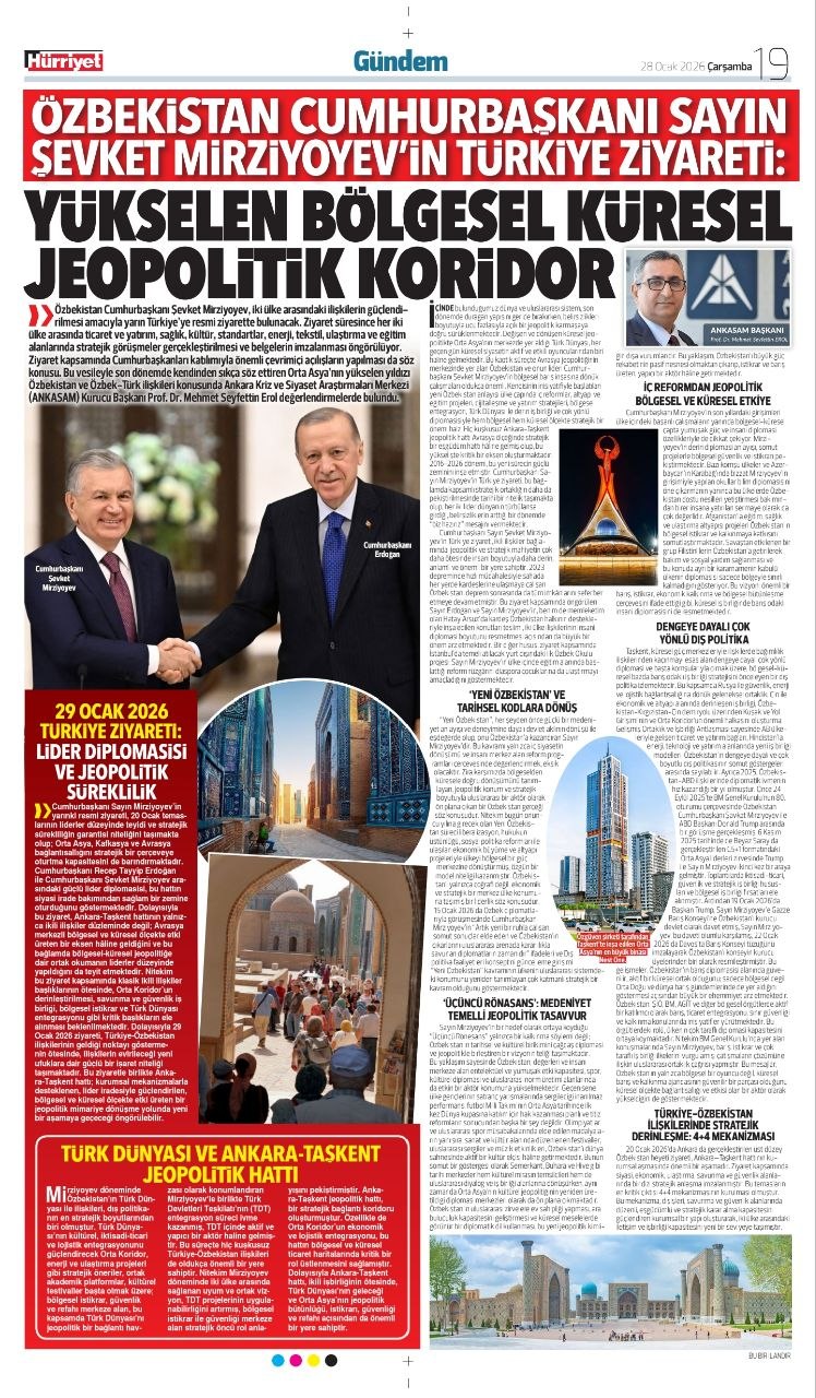 Шу муносабат билан Анқара инқироз ва сиёсат тадқиқотлари маркази (АНКАСАМ) раҳбари, профессор Меҳмет Сейфеттин ЭРОЛ сўнгги пайтларда тез-тез тилга олинаётган Марказий Осиёнинг юксалаётган юлдузи Ўзбекистон ва Ўзбекистон-Туркия муносабатлари ҳақида ўз фикрларини билдирди. Мақола “Hürriyet” газетасида 2026 йил 28 январ куни нашр этилди.