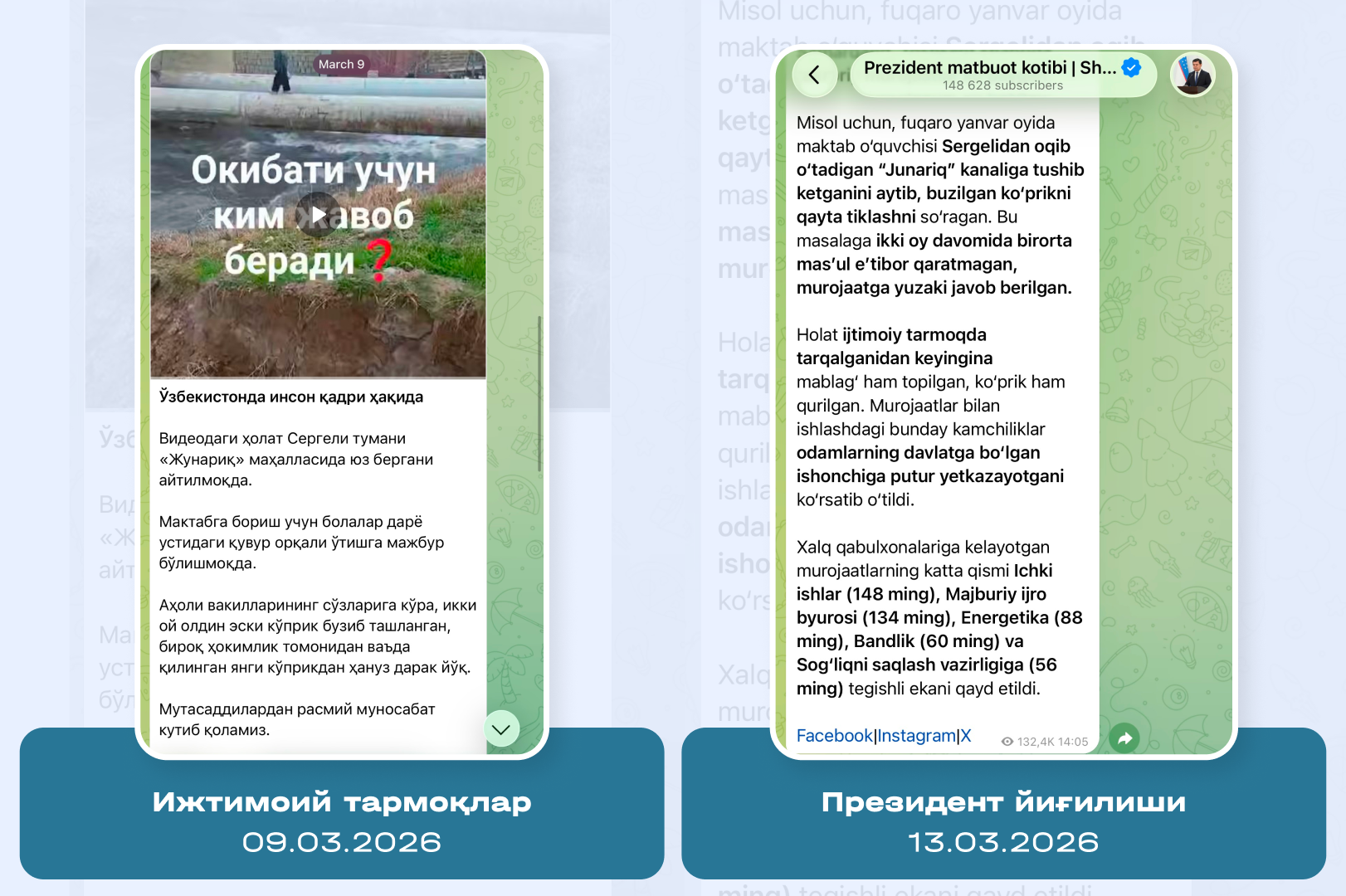 Бу ҳолат бир нарсани кўрсатади: ижтимоий тармоқлардаги сигналлар, аҳоли мурожаатлари ва жамоатчилик фикри давлат қарорларига таъсир кўрсатадиган реал механизмга айланди. Бунда Коммуникациялар депратаментини эътироф этиш лозим. Департамент реал вазиятни Президентга етказувчи самарали кўприк вазифасини аъло даражада бажармоқда.