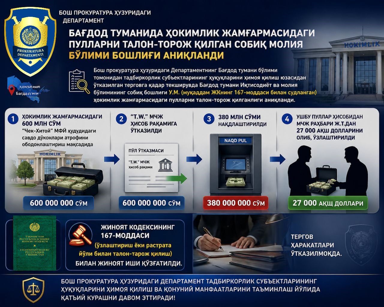 Унда Бағдод тумани Иқтисодиёт ва молия бўлимининг собиқ бошлиғи У.М. (муқаддам ЖКнинг 167-моддаси билан судланган) ҳокимлик жамғармасидаги 600 млн сўмни “Чек-Хитой” МФЙ ҳудудидаги савдо дўконлари атрофини ободонлаштириш мақсадида "T.W." МЧЖ ҳисоб рақамига ўтказиб, 380 млн сўмини нақдлаштиргани аниқланди. Амалдор ушбу пуллар ҳисобидан МЧЖ раҳбари Ж.Т.дан 27 000 АҚШ долларини олиб, ўзлаштириш йўли билан талон-тарож қилганлиги аниқланган.