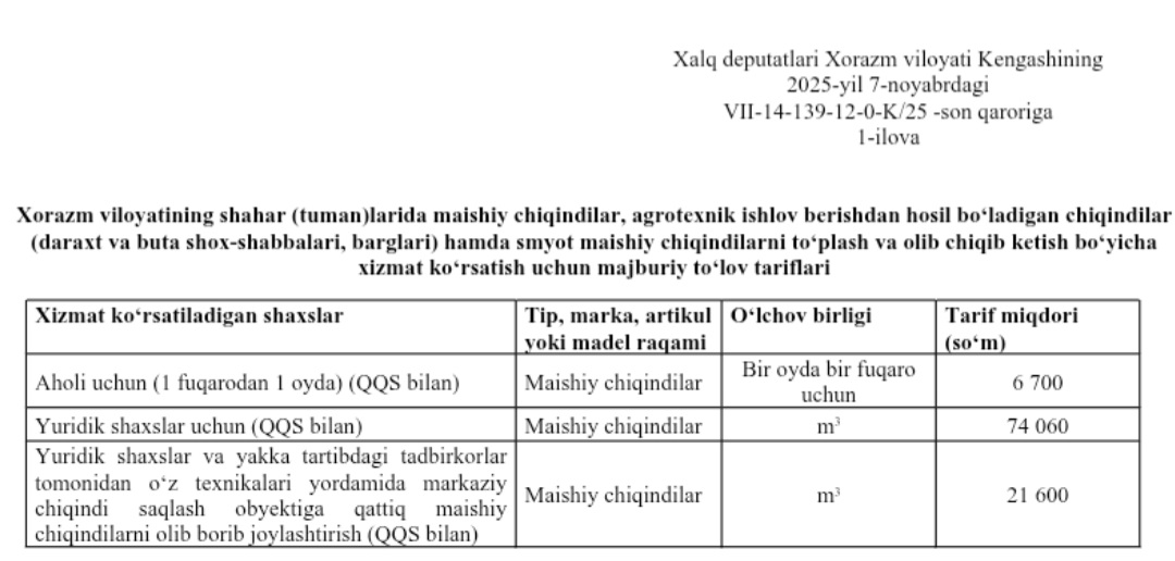 Xorazm viloyatida maishiy chiqindi olib ketish narxlari oshiriladi. Bu haqda Xalq deputatlari Xorazm viloyati kengashining qarori eʼlon qilindi. Qaror 2025 yil 7 noyabr kuni imzolangan.