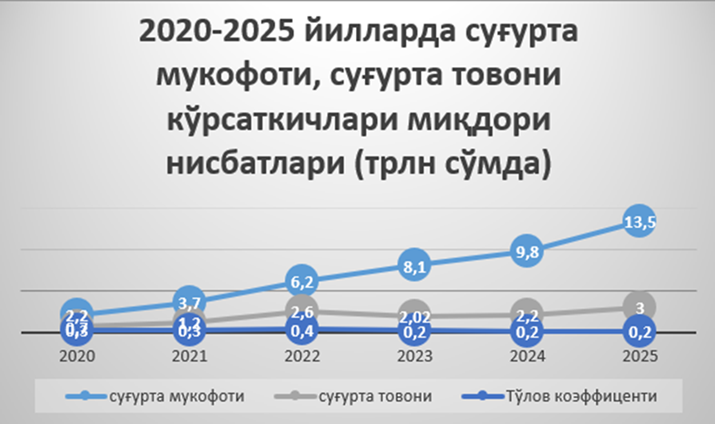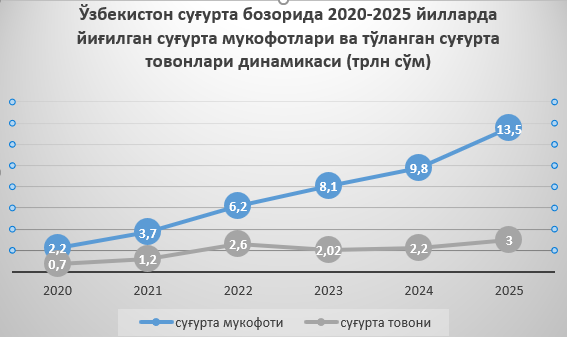 2020-2025 yillarda Oʻzbekiston sugʻurta bozorida yigʻilgan sugʻurta mukofotlari va toʻlangan sugʻurta tovonlari dinamikasi izchil oʻsish tendensiyasini namoyon etdi. Ushbu davrda bozor hajmining kengayishi, yangi ishtirokchilarning kirib kelishi va sugʻurta xizmatlariga boʻlgan talabning ortishi asosiy omillardan boʻldi. Tahlillar shuni koʻrsatadiki, 2020 yildan boshlab sugʻurta mukofotlari hajmi yildan yilga oʻsib borgan. Agar 2020 yilda bozor hajmi nisbatan past boʻlgan esa, 2023-2024 yillarga kelib u bir necha barobarga oshgan. 2024 yilda sugʻurta mukofotlari hajmi qariyb 9-10 trln soʻmga yetgani bozorda yuqori oʻsish surʼatlari saqlanib qolayotganini koʻrsatadi. Bunga majburiy sugʻurta turlarining kengayishi, korporativ mijozlar ulushining ortishi, raqamli sugʻurta xizmatlarining joriy etilishi sabab boʻldi.